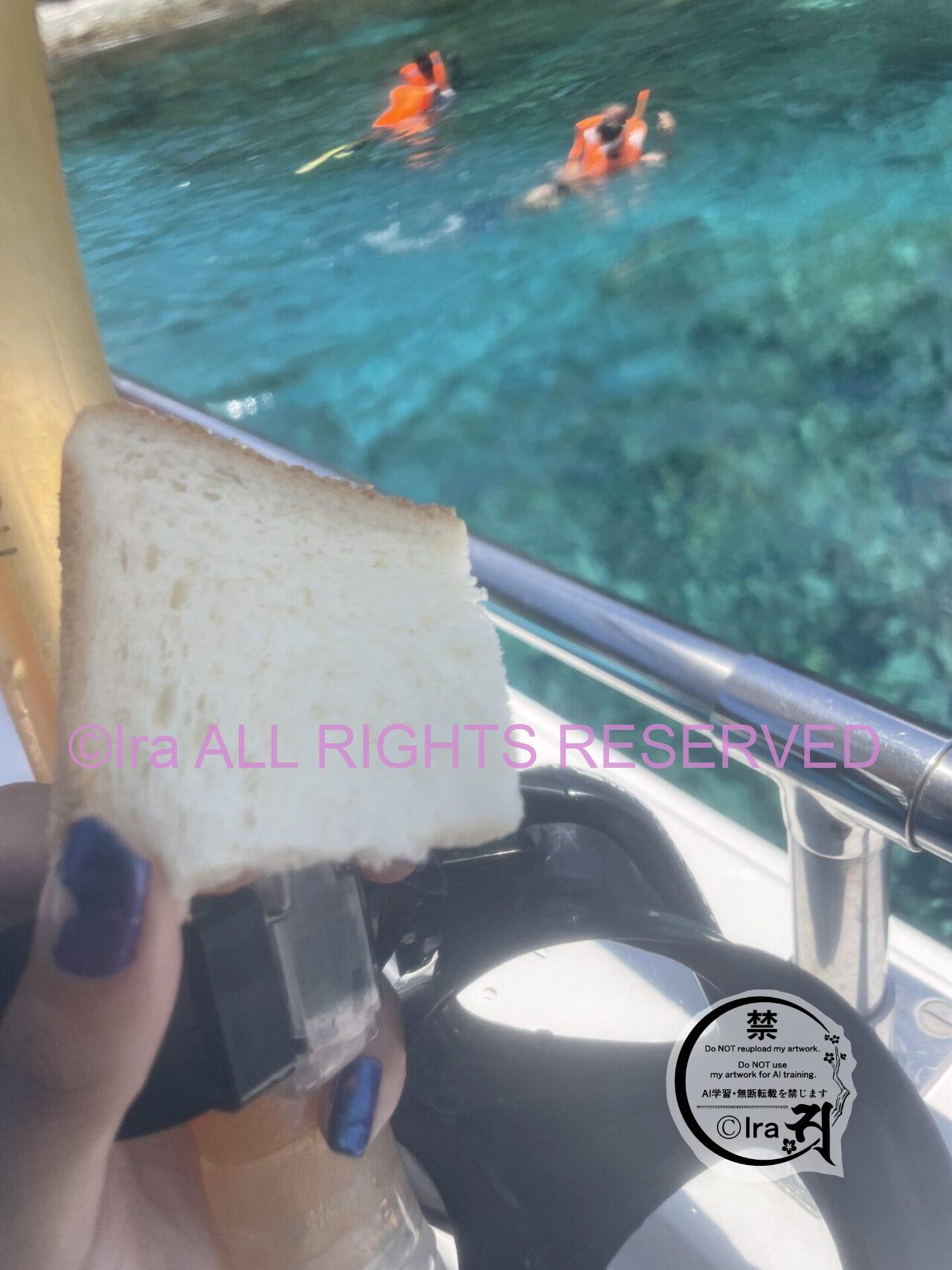 On Anijima, you will be given this bread. It is bait to attract fish. In World Natural Heritage sites, it was permitted to feed bread to the fish.